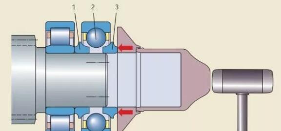 ①當調整背對背軸承配置時,將鎖緊螺母或螺栓擰到端板中,并偶爾轉動一下軸。對于具有游隙的軸承配置,使用千分表測量剩余軸向游隙,如果剩余游隙過大,請擰緊鎖緊螺母或端板螺栓。如果剩余游隙過小,請卸下軸承,然后重新開始。